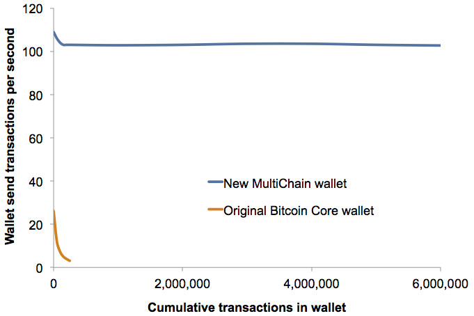 The consequence is that, with around 20,000 transactions stored, Bitcoin Core’s wallet slows down significantly. After 200,000 or so, it practically grinds to a halt. Even worse, since a MultiChain blockchain allows up to 8 MB of metadata per transaction (compared to bitcoin’s 80 bytes), the wallet’s memory requirements can balloon rapidly even with a small number of transactions.