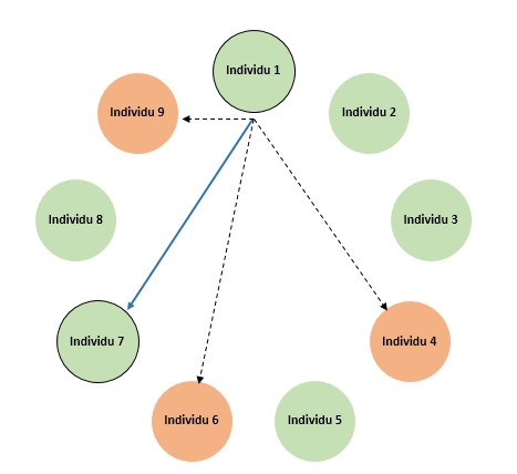 Dans le cadre d’une architecture distribuée, la confiance des participants ne repose pas sur une figure tutélaire gérant les échanges. La confiance repose sur la multitude des participants et la multitude des possibilités de vérifications des échanges. Dans l’exemple ci-dessous, l’individu 1 souhaite réaliser une transaction avec l’individu 7. Le paiement passe directement d’un individu à l’autre, mais l’ordre de transaction est vérifié par les individus « miners » 4, 6 et 9. Une fois la transaction vérifiée et validée, elle est inscrite dans le grand registre visible par tous.