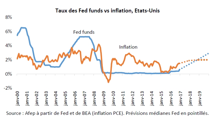 Comme cela était attendu, la Réserve fédérale des Etats-Unis a procédé à une hausse de taux pour sa dernière réunion de l’année : la cible pour les « Fed Funds » (FF) est ainsi passée de la fourchette comprise entre 0,25 % et 0,5 % à celle comprise entre 0,5 % et 0,75 % à compter du 15 décembre. Dans les projections dévoilées en complément de la décision (« dot plots »), il apparaît qu’une majorité de participants au comité de politique monétaire (FOMC) envisage plusieurs hausses l’an prochain : sur 17 participants, 4 d’entre eux en envisagent 2, 6 en envisagent 3 et 3 en envisagent 4. Il en résulte un scénario médian où le taux des FF serait de 1,4 % fin 2017. Comment caractériser l’univers dans lequel la Fed devra évoluer l’an prochain ? D’un côté, les voyants « macro » nord-américains sont au vert, avec une remontée de l’inflation, un rythme de croissance légèrement supérieur à son potentiel et un marché du travail proche du plein emploi qui justifient un resserrement graduel de la politique monétaire. De l’autre, des faiblesses domestiques persistantes (baisse du taux d’activité, inégalités) et l’ampleur des incertitudes géopolitiques nationales et internationales pourraient bien perturber ce dernier. A cet égard, il est intéressant de noter que le FOMC de décembre 2015 prévoyait un taux des FF de 1,4 %… fin 2016 ! Avec une seule hausse décidée au cours de l’année, le FOMC a choisi dans les faits une orientation encore plus accommodante que le bas de la fourchette de décembre 2015 (deux hausses).