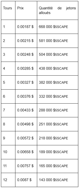- Tours de prévente : 80 % de l’approvisionnement total en jetons sera disponible à l’achat lors des tours de prévente. Il y en aura 12 au total. Chaque tour aura une allocation fixe ;