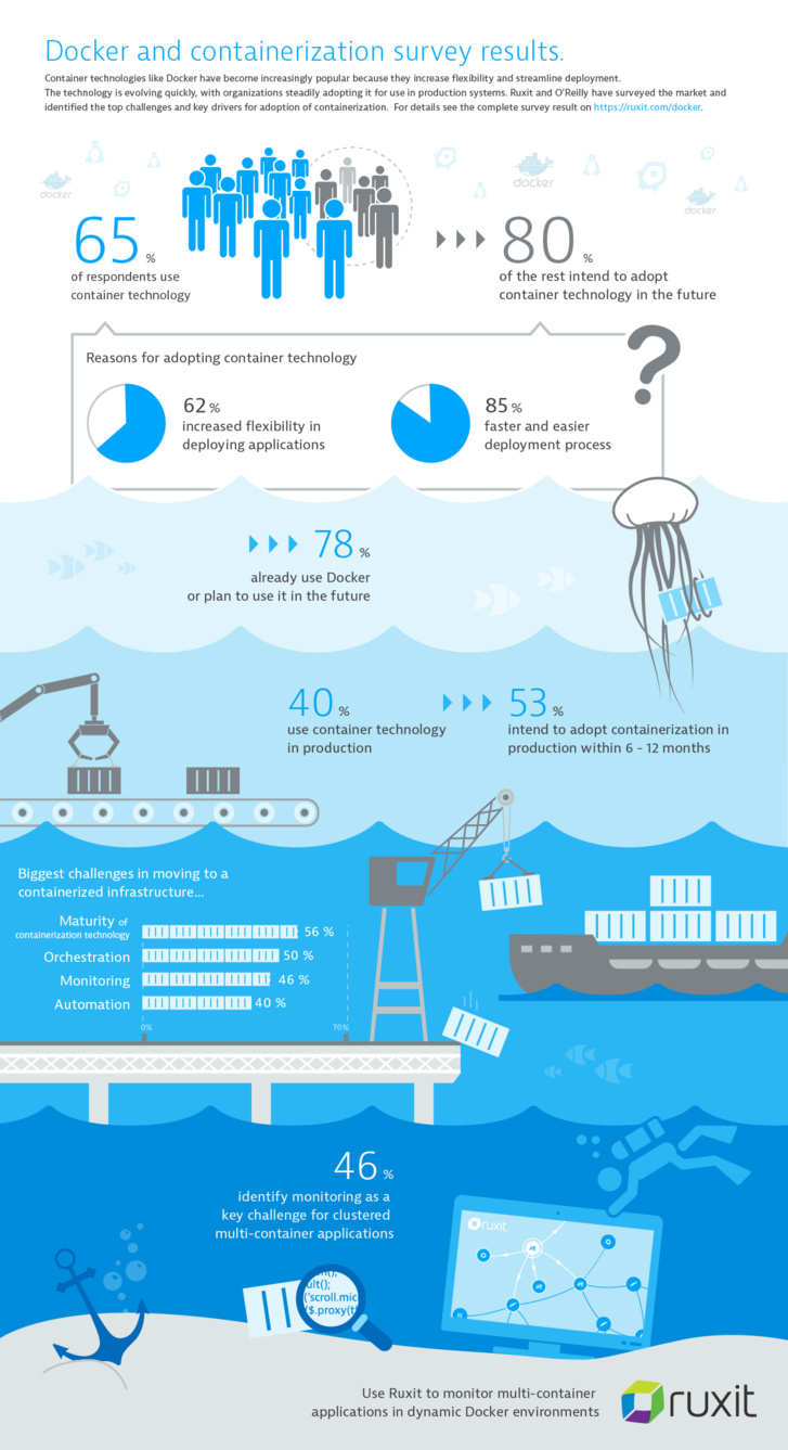 Les résultats de cette enquête confirment le besoin de solutions prêtes à l’emploi, stables et intégrées pour faire face aux défis spécifiques des environnements « conteneurisés ». Ruxit est d’ailleurs l’unique solution du marché à pouvoir monitorer la performance des applications s’executant au sein de conteneurs sans avoir à déployer d’agent dans chacun d’entre eux. Un seul agent par hôte (pouvant lui-même englober un grand nombre de conteneurs) suffit, offrant ainsi aux entreprises une simplicité d’installation et une évolutivité inégalées.