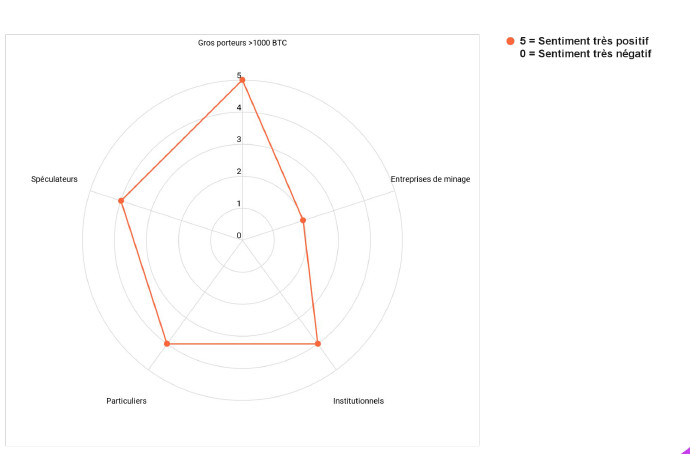 Sur le positionnement des 5 grandes catégories d’investisseurs que nous suivons, les indicateurs restent plutôt très positifs à l’exception des entreprises de minage qui profitent de la solidité actuelle du marché pour vendre une partie de leur stock. De leur côté, les spéculateurs restent avec un positionnement acheteur marqué, ce qui commence à être un facteur de risque en cas de correction soudaine.