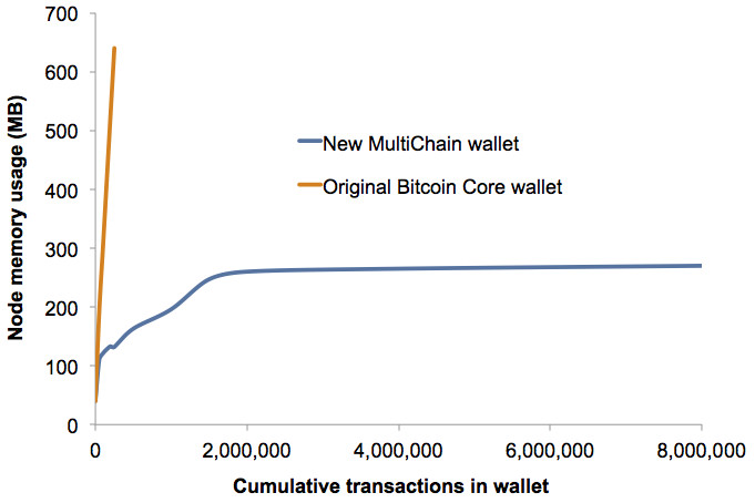 The consequence is that, with around 20,000 transactions stored, Bitcoin Core’s wallet slows down significantly. After 200,000 or so, it practically grinds to a halt. Even worse, since a MultiChain blockchain allows up to 8 MB of metadata per transaction (compared to bitcoin’s 80 bytes), the wallet’s memory requirements can balloon rapidly even with a small number of transactions.
