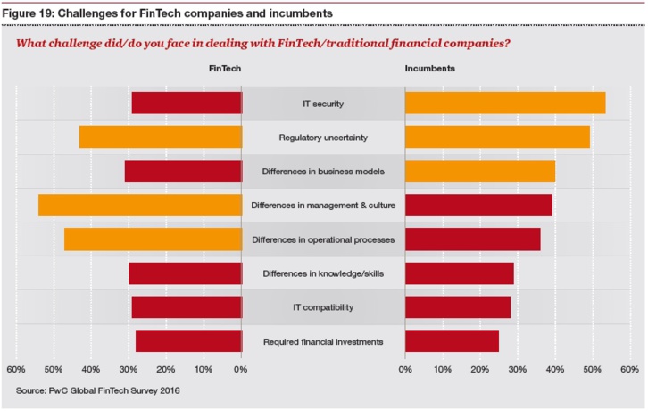 Du côté des FinTech, les trois principaux défis qui se posent à elles lorsqu’elles doivent travailler avec des entreprises traditionnelles de services financiers sont : les différences de gestion et différences culturelles (54%), les procédures opérationnelles (47%) et les incertitudes réglementaires (43%).