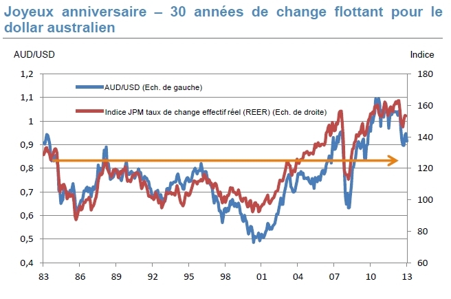 – Jeudi dernier coïncidait avec le 30ème anniversaire de l’adoption du régime de change flottant pour le dollar australien. Celle-ci a débuté en 1983 sur une parité de 0,9050. A l’ouverture du marché de Londres jeudi dernier, cette devise s’échangeait à …0,9050.