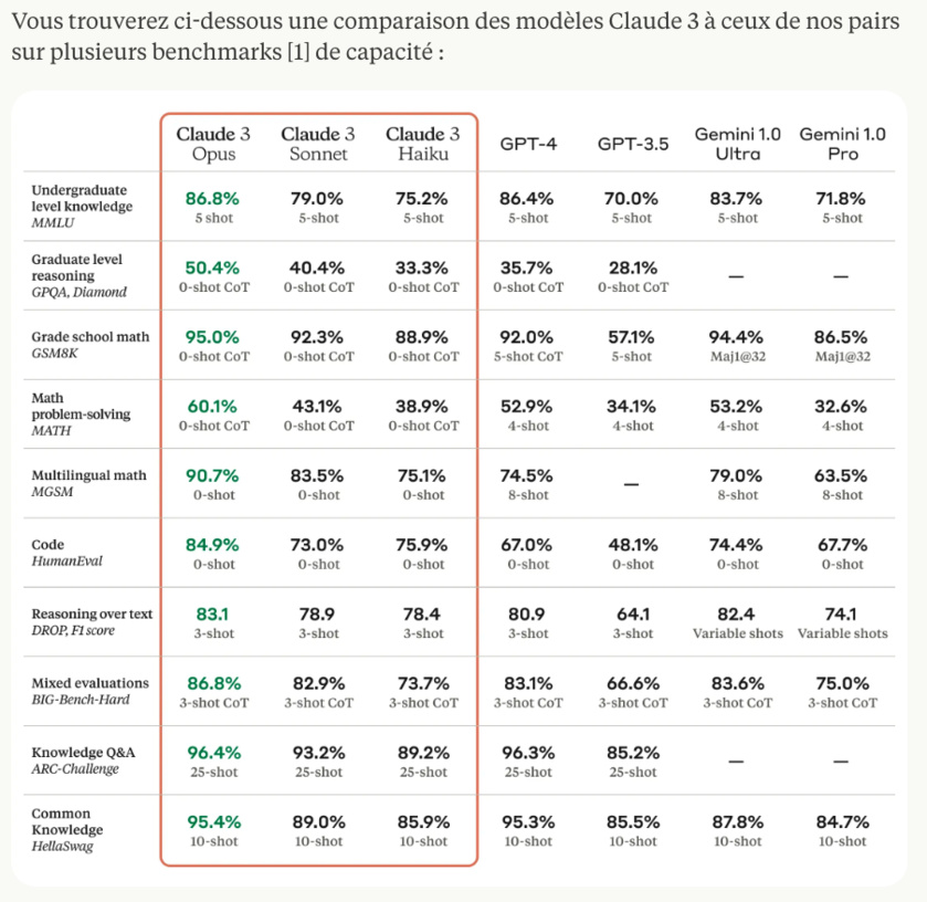 Claude 3 est déclinée en 3 modèles pour ordre croissant de capacités : laude 3 Haiku, Claude 3 Sonnet et Claude 3 Opus. Chaque modèle successif offre des performances de plus en plus puissantes, permettant aux utilisateurs de sélectionner l’équilibre optimal entre intelligence, vitesse et coût pour leur application spécifique.