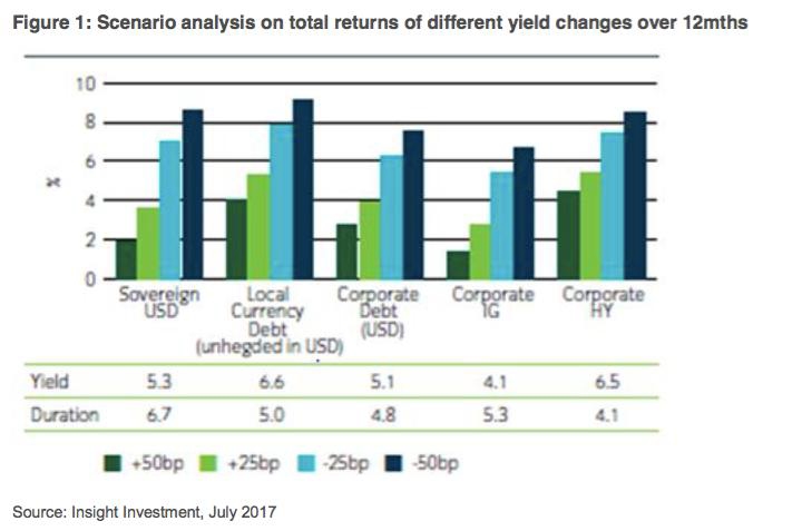 Pour les marchés émergents, ce contexte de rebond de la croissance mondiale mais de pressions inflationnistes limitées permettra probablement d’atténuer une partie de la volatilité qui résultera de la hausse des rendements des pays développés. Les rendements réels de la dette émergente libellée en devise locale frôlent actuellement des hauts historiques, à mesure que l’effet d’entraînement des dévaluations passées de certaines monnaies se fait sentir et la hausse des prix de l’énergie s’estompe. Une hausse des rendements des marchés développés, où les rendements réels sont à contrario historiquement bas, ne se traduira donc pas forcément par une hausse des rendements des marchés émergents de la même ampleur. S’ils venaient toutefois à fluctuer à un degré similaire à ceux des marchés développés, les rendements nominaux plus élevés des marchés émergents donneraient effectivement plus de protection aux investisseurs. Le Graphique 1 ci-dessous illustre les rendements générés par chacune des classes d’actifs dans l’univers de la dette émergente selon des différents scénarios en matière de taux d’intérêt.