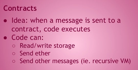 Contrairement à la blockchain du bitcoin, Ethereum intègre un langage de programmation Turing-complet qui permet d’exposer des méthodes qui sont appelées dynamiquement par d’autres contrats ou par des agents externes.