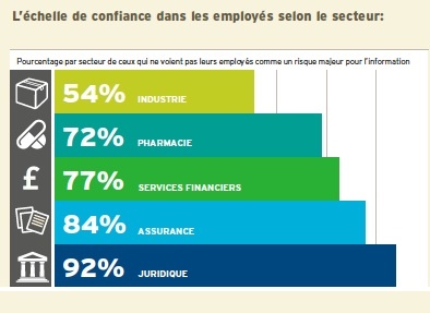 Cette défiance manifeste des dirigeants du secteur de l’industrie vis-à-vis du personnel cache des préoccupations particulièrement vives concernant les violations de données. Ils sont en effet près d’un tiers (32 %) à craindre les suites juridiques d’une perte de données accidentelle, soit 2 fois plus que la moyenne (16 %), et 48 % à redouter les pertes financières d’une violation, contre 33 % en moyenne. 16 % pensent également qu’une violation de données pourrait menacer l’existence même de leur entreprise. C’est 3 fois plus que la moyenne tous secteurs confondus.
