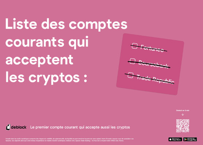 Télévision : des spots publicitaires seront diffusés dès ce lundi 6 janvier en sponsoring notamment sur l’émission Quotidien pour 4 semaines sur TMC et sur l’ensemble de la météo sur CNews pour 6 semaines sur lors du premier trimestre.Sous le slogan, "Votre carte, votre IBAN, vos cryptos.", Deblock souligne la simplicité et la transparence qui le définissent depuis ses débuts.