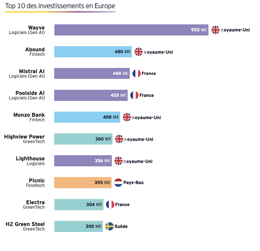 Quant au Top 5 des plus grosses levées de l'année, il est constitué par Mistral AI (468 M€), Poolside (453 M€) Electra (304M€), HR Path (250 M€) et HysetCo (200 M€).