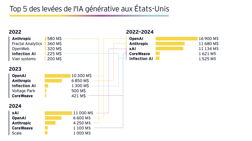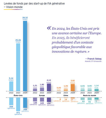 2. L’IA générative modifie le paysage mondial. Les États-Unis s’installent en leader mondial, avec plus de 38 Md$ levés en la matière (+ 52 % vs 2023); contre 4,1 Md$ pour les start-up européennes – plus du double par rapport à 2023 néanmoins.