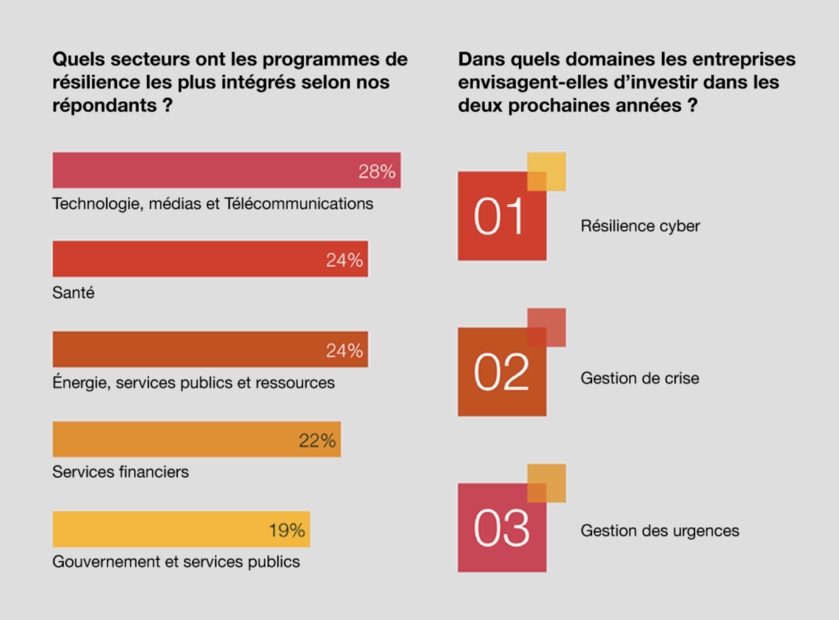 « Les chefs d’entreprise sont confrontés à un niveau de perturbation sans précédent et à une incertitude dans un environnement – économique, juridique et sociétal – en évolution rapide. Les entreprises sont confrontées à des forces macroéconomiques externes et à des transformations internes de l’entreprise. Dans ce contexte, la résilience est devenue l’une des priorités stratégiques les plus vitales du monde de l’entreprise. » déclare Julien Muller, directeur crise et résilience chez PwC France et Maghreb.