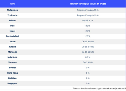 Les données sur la taxation des cryptomonnaies en Asie montrent des écarts significatifs, reflétant des approches variées en matière de régulation et d’attractivité fiscale. Les pays comme Brunei, Hong Kong, la Malaisie et Singapour se démarquent par une absence totale d’imposition, favorisant un environnement attractif pour les investisseurs. À l’inverse, des nations telles que le Japon (15 à 55 %), Taïwan (5 à 40 %), et l’Inde (30 %) appliquent des taux élevés ou progressifs, indiquant une volonté de réguler ce secteur tout en générant des revenus fiscaux. La Chine interdit purement le commerce, optant pour un contrôle strict. Enfin, des pays comme l’Indonésie (0,1 %) et le Vietnam (0 à 5 %) adoptent des taux très faibles, reflétant une approche intermédiaire pour stimuler ce marché émergent tout en maintenant un certain cadre de régulation. Cette diversité illustre l’absence d’une politique fiscale unifiée dans la région.