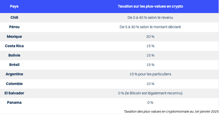 En Amérique latine, la taxation des plus-values en crypto-monnaies varie considérablement d’un pays à l’autre, reflétant des approches fiscales disparates. Le Chili impose une taxation progressive, allant jusqu’à 40 % selon le revenu, tandis que le Pérou applique un taux de 5 à 30 % en fonction du montant déclaré. Des pays comme le Mexique, le Costa Rica, la Bolivie, le Brésil et l’Argentine adoptent une taxation standard de 15 % pour les particuliers. La Colombie, quant à elle, impose environ 10 %. Toutefois, certains pays se démarquent par une absence de taxation : au Panama, il n’y a aucune imposition, et au Salvador, où le Bitcoin a cours légal, la fiscalité est également nulle. Il est important de noter que de nombreux pays de la région, tels que le Paraguay ou l’Uruguay, n’apparaissent pas dans ces données en raison de l’absence de cadre législatif ou réglementaire clair concernant les crypto-monnaies. Cela souligne la nécessité d’une harmonisation et d’une clarification des politiques fiscales dans la région.