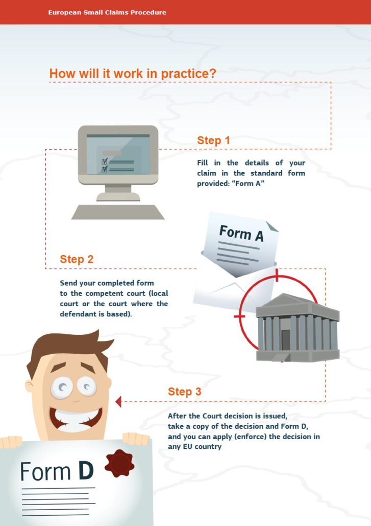 La procédure des petits litiges pourrait être utilisée par exemple par un consommateur qui commande sur Internet un produit d’un autre pays de l’UE, le reçoit dans un état défectueux, mais ne parvient pas à un accord avec le vendeur concernant une compensation. L’acheteur aurait simplement besoin de soumettre un formulaire standard multilingue au tribunal compétent. Si la juridiction se prononce en faveur de ce consommateur, la décision serait automatiquement appliquée dans les pays concernés.