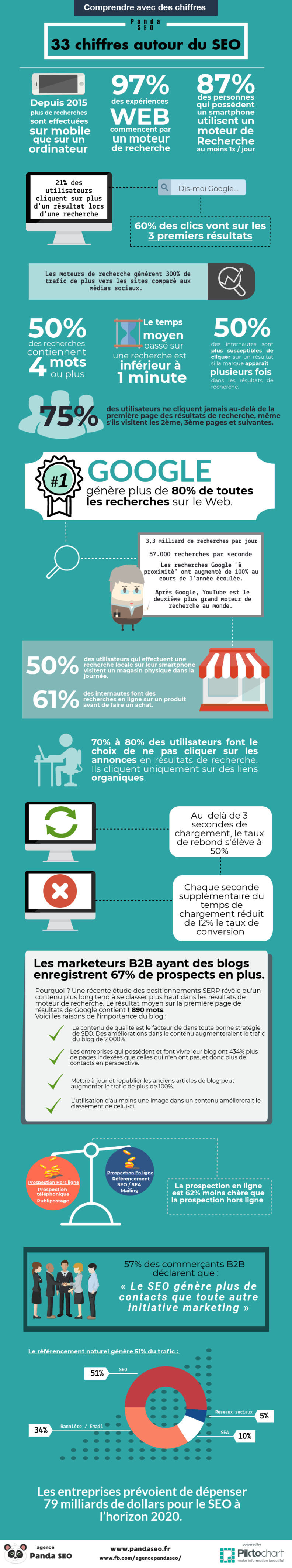Pour s’en convaincre, et parce qu’une image vaut toujours mieux que mille mots, découvrez cette infographie, signée Panda SEO, l’agence de référencement naturel présentant 33 chiffres à connaître autour du référencement.