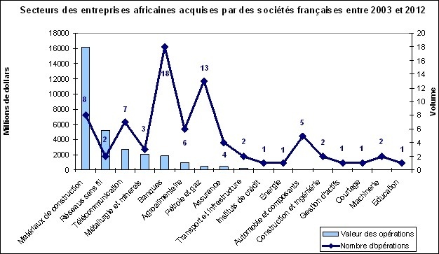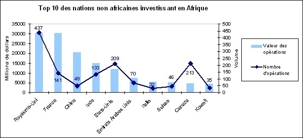 – Avec 141 transactions réalisées, dont l’acquisition par Lafarge de l’égyptien OCI Cement, la France est le deuxième investisseur (en valeur) non africain en Afrique sur les dix dernières années, derrière le Royaume-Uni et devant la Chine.