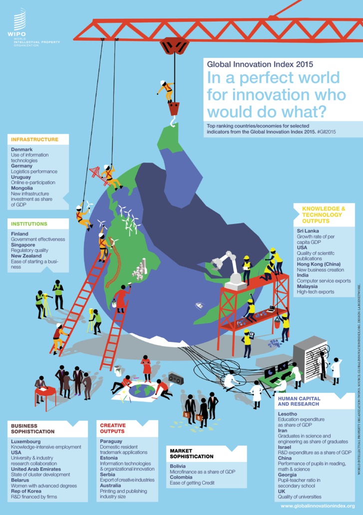 The GII 2015 looks at “Effective Innovation Policies for Development” and shows new ways that emerging-economy policymakers can boost innovation and spur growth by building on local strengths and ensuring the development of a sound national innovation environment.