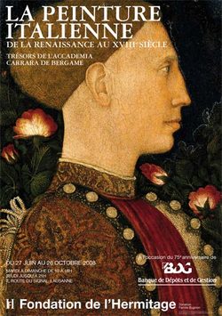 Aussi le public s’émerveillera-t-il autant de la pensive Vierge à l’Enfant de Giovanni Bellini que de l’émouvante Madone de Titien, environnée d’un paysage harmonieux et serein. Du célèbre Saint Sébastien de Raphaël, plein d’une grâce délicate, aux scènes expressives et colorées de Lorenzo Lotto, de nombreux chefs-d’oeuvre témoignent de l’extraordinaire richesse du musée de Bergame. Parmi les joyaux de l’exposition figurent le précieux portrait de Lionello d’Este par Pisanello, dont l’art raffiné s’inscrit dans le gothique international tardif, ou les natures mortes aux instruments de musique de Baschenis, à la modernité troublante. Les vues vénitiennes de Canaletto et Guardi, dont l’atmosphère cristalline et la luminosité intense marquent l’apogée du paysage italien au XVIIIe siècle, constituent le somptueux finale de cette présentation exceptionnelle.