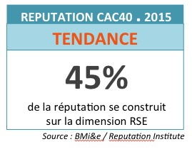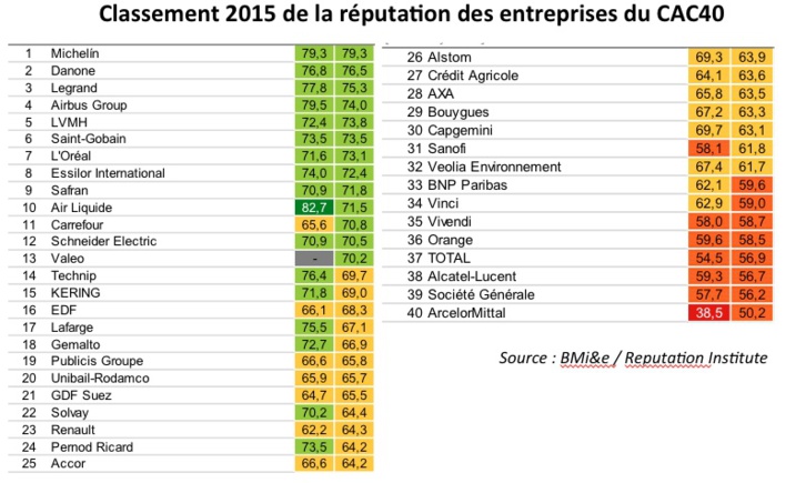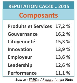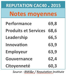 Alors que les entreprises du CAC40 réalisent leurs meilleurs résultats depuis cinq ans et redeviennent optimistes, l’indice de réputation -qui traduit la relation de confiance des Français vis-à-vis des entreprises du CAC40 – baisse pour la 1ère fois depuis 2011. Il se contracte à 66,1 en 2015 contre 67,7 en 2014. Cette année, 13 entreprises seulement dépassent le score de 70 (réputation forte) contre 17 l’an passé et 8 entreprises affichent une réputation vulnérable contre 7 en 2014.