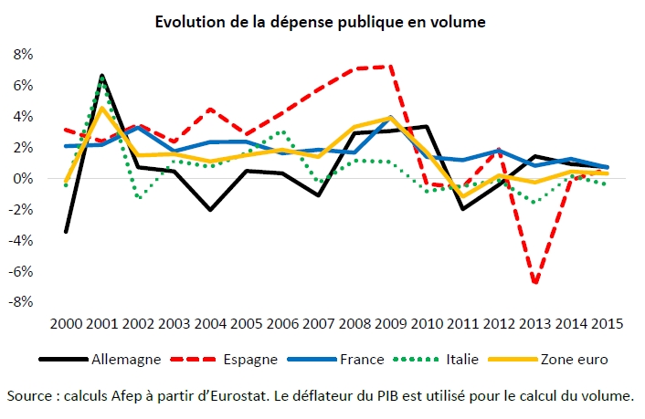 Dans le débat politique, la question de la dépense publique est souvent abordée par le biais du ratio dépense/PIB, ce qui fait ressortir les différences de choix de société, même si l’Europe demeure une zone où la prise en charge publique est importante par rapport à d’autres pays avancés (Canada, Etats-Unis, Japon). Si elle est plus technique, l’évolution de la dépense en volume (i.e. en corrigeant de l’effet-prix) permet de mesurer les dynamiques. Depuis 1999, deux enseignements peuvent être tirés au niveau des principaux pays de la zone € : i) en amont de la Grande récession, une hausse de la dépense publique en ligne avec la croissance du PIB, à l’exception notable de l’Allemagne, où cette dernière a été plus dynamique ; ii) une inflexion avec la crise, particulièrement marquée au Sud de l’Europe, où la dépense recule depuis 2010, tandis que l’Allemagne poursuit une tendance de croissance modérée. En comparaison, la dépense française décélère bien mais reste positive (+ 1,2 % par an entre 2010 et 2015, soit un point de plus que la zone €). Il est à noter que la France est le seul pays où la dépense publique n’a jamais reculé au cours des 15 dernières années, que ce soit en valeur ou en volume.
