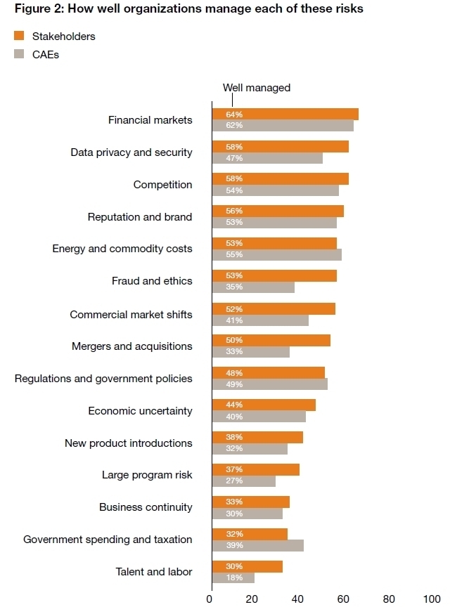 L’enquête montre également que les fonctions audit interne des entreprises les plus avancées vont au-delà des constats sur les faiblesses et ont un rôle beaucoup plus moteur dans l’amélioration des dispositifs de gestion des risques et des contrôles. Ainsi, 78% des répondants à l’enquête faisant état d’une gestion des risques performante affirment que les directeurs de l’audit interne jouent un rôle actif au sein des comités de direction. En outre, ceux-ci tiennent compte dans leurs travaux du processus de gestion des risques de leur entreprise et savent adapter leur approche rapidement lorsque des changements sont nécessaires.