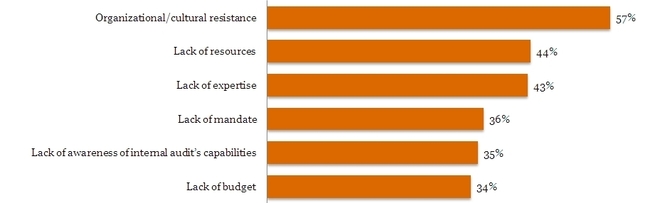 La principale barrière citée pour que l’audit interne atteigne ces nouvelles exigences est la résistance au changement – aussi bien organisationnelle que culturelle. Vient immédiatement après le manque de ressources et d’expertise en audit interne, qui ne permet pas toujours de répondre aux questionnements des parties prenantes et aux analyses approfondies demandées.