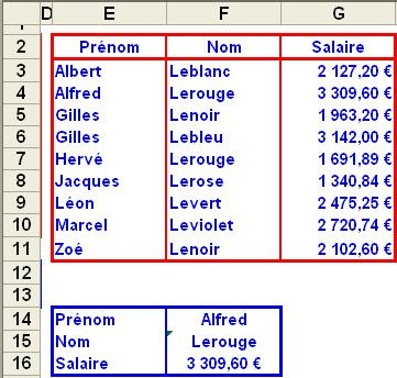 Une grosse erreur aurait été d’utiliser la formule =recherchev(F15;F3:G11;2) en cherchant le salaire à partir du nom. En effet, les noms ne sont pas en ordre alphabétique et vous obtenez alors n’importe un résultat souvent – mais pas toujours – faux, vu la façon dont marche l’algorithme de recherche.