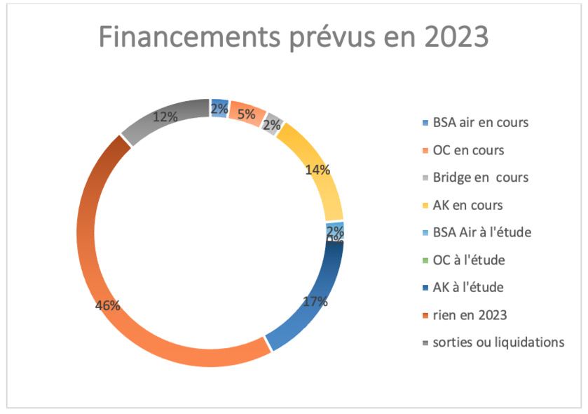 Face à ces informations, nous avons mené début 2023, grâce à notre réseau d’accompagnateurs, un sondage sur les perspectives des sociétés de notre portefeuille, sondage axé sur les besoins en financements à court et moyen terme et les sorties. Le but de cette étude était d’intégrer dans notre flux 2023 les levées ou bridges, en s’assurant que notre réseau trouverait les ressources indispensables à ces refinancements sans ralentir pour autant les levées de premiers tours.