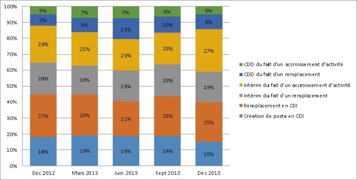 – Les créations de postes sont restées stables durant les 3 premiers trimestres 2013 (19 %). La baisse s’est manifestée sur le dernier trimestre uniquement (15 %).