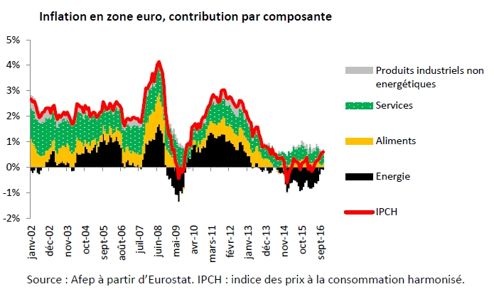 Après 18 mois de progression très faible des prix en zone euro (dont certains mois en territoire négatif), couronnant un cycle de désinflation entamé en 2011, l’inflation aurait repris une tendance ascendante depuis le début du second semestre 2016. La fin de la baisse du cours du baril de pétrole puis sa hausse au cours de l’année aurait enclenché un « effet-base » positif qui devrait se poursuivre et s’amplifier en 2017 : selon les dernières prévisions de l’Eurosystème, les prix énergétiques expliqueraient les 4/5e de la progression de l’inflation entre 2016 (0,2 % en moyenne annuelle) et 2017 (1,3 %). Sans anticiper de forte augmentation du cours l’an prochain en raison notamment de l’abondance des stocks, les observateurs estiment toutefois que le pétrole serait soutenu par un resserrement de l’offre (accord trouvé à l’OPEP le 30 novembre sur une baisse de la production au 1er semestre 2017) et par une demande un peu plus dynamique. Dans ce contexte, la BCE devrait se montrer particulièrement vigilante sur l’évolution des prix hors énergie et alimentation : relativement atone, l’inflation « sous-jacente » (ISJ) ne reflète pas encore l’amélioration globale de l’économie européenne. Pour l’Eurosystème, l’ISJ serait pourtant le principal moteur du regain d’inflation à compter de la mi-2017.