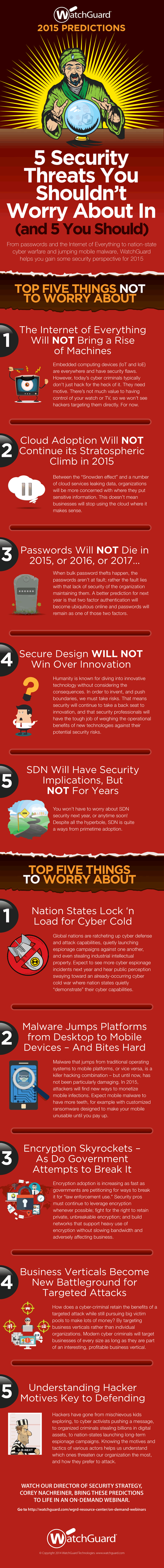 « En tant que professionnels de la sécurité, nous consacrons beaucoup de temps à détecter les problèmes et à envisager le pire. En 2014, de nombreuses vulnérabilités et menaces ont été identifiées, notamment Heartbleed, Regin, Operation Cleaver, etc. », commente Corey Nachreiner, Director of Strategy and Research chez WatchGuard Technologies. « Face à ces importantes annonces, nous avons voulu aider les professionnels de la sécurité à y voir plus clair et à se concentrer sur ce qui compte vraiment. Voici donc cinq tendances à prendre en compte et cinq autres à oublier. »