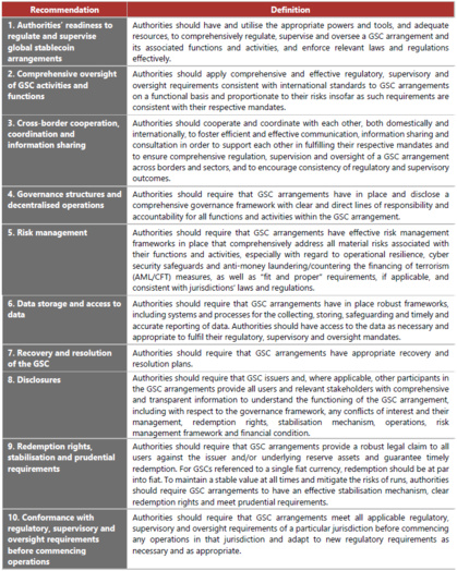 En réponse, en 2019, le Groupe des Vingt (G20) a chargé le Conseil de stabilité financière (CSF) d’examiner les questions réglementaires soulevées par les accords du GSC et de donner des conseils sur les réponses multilatérales, le cas échéant. Par la suite, en octobre 2020, le FSB a publié des recommandations de haut niveau pour la réglementation, la surveillance et la surveillance des accords mondiaux de stablecoin . Après examen, le FSB a publié une version finale en juillet 2023 dans le cadre de son cadre réglementaire mondial pour les activités sur les cryptoactifs.