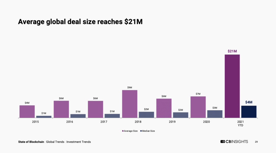 – This year NFTs took flight. NFT funding skyrocketed to over $2 billion in 2021, with a growth rate of 6,523% over 2020s 12- month total. More than 90% of NFT deals this year have been early-stage. There were 46 deals to NFT startups in Q3’21, 3 of which were mega-rounds.