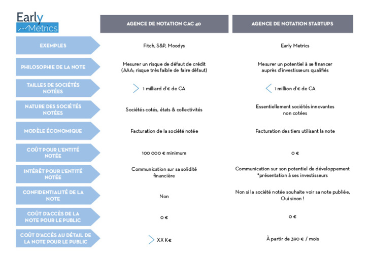 Antoine Baschiera, co-fondateur d’Early Metrics explique : « Nous ne sommes pas juge et parti comme les agences de notation traditionnelles qui notent leurs clients. Pour éviter tout conflit d’intérêt, nous notons d’un côté les startups gratuitement et de l’autre, les investisseurs nous payent chaque mois pour recevoir nos notations. A partir de 390 €/mois ils reçoivent un bulletin de veille de 6 startups en phase en ligne avec leurs attentes.»