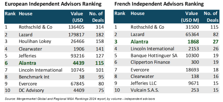 Alantra, un exercice 2024 en forme et une 3ème place en tant que conseil M&A indépendants en France