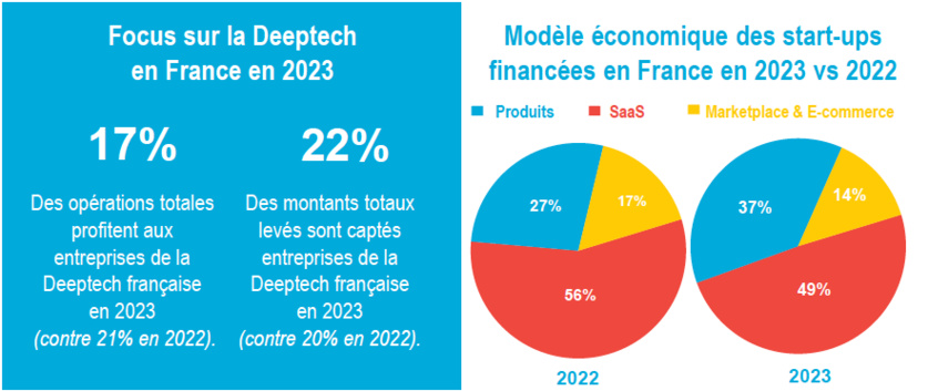 •L’année 2023 a été marquée par la montée en puissance de l’intelligence artificielle générative, dont les levées successives réalisées par Mistral AI de 100 M€ en mai et de 385 M€ en décembre 2023 sont la meilleure illustration. Elle s’est également traduite par une réallocation des financements à destination des start-ups proposant des technologies de rupture (Deeptech), qui ont capté près du quart des montants levés (22%).