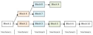 So now, the protocol allowed a slice of time to publish the new authorized block. But what if this is not enough and someone else also certified a block at the same time (either by coincidence or with evil intention)? The network can’t take this risk. So, the protocol assumes that two certified blocks can point to the same previous block. This situation is called a "fork" and looks like this: