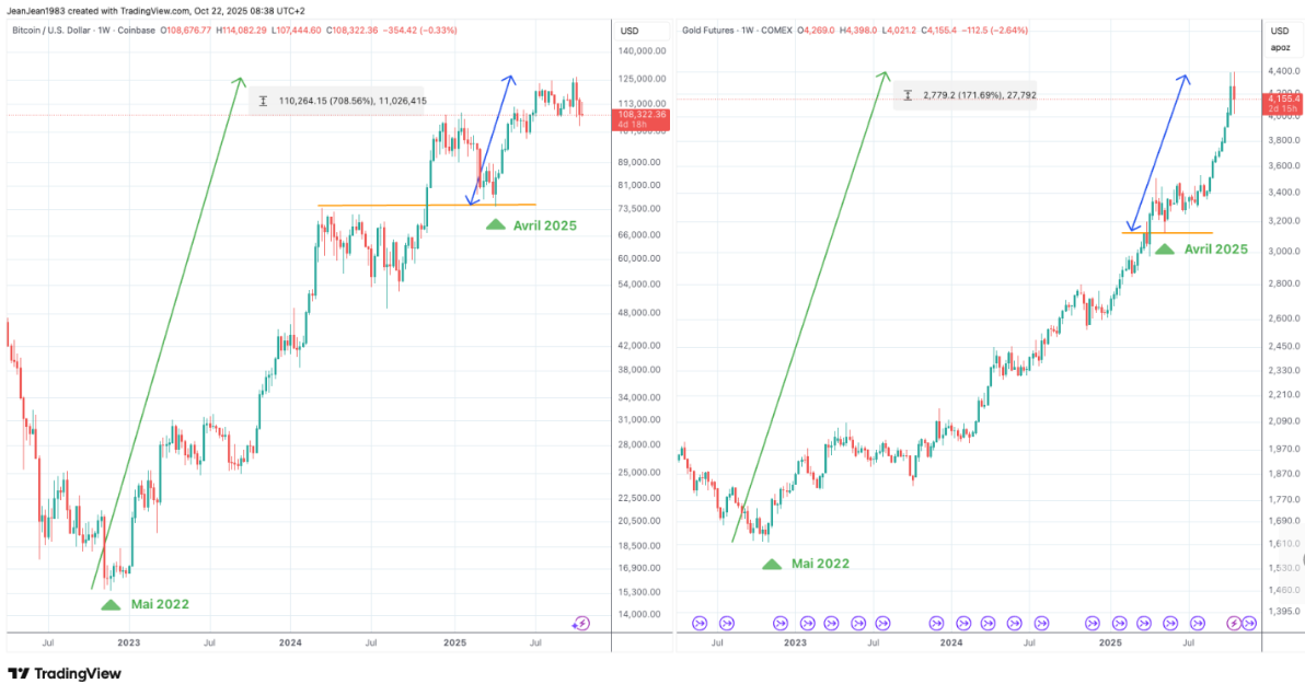 Depuis mai 2022, le Bitcoin et l’or évoluent d’ailleurs dans une tendance haussière symétrique, alimentée par la fragmentation géopolitique mondiale (Ukraine, Moyen-Orient, Chine–Taïwan).