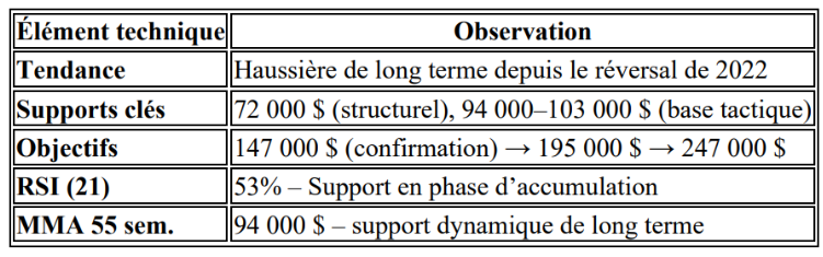 - Sur un horizon Stratégique (12/36 mois): Le support clé des 72 000 $, ancien plus haut historique de 2021, agit comme niveau pivot du cycle haussier actuel, garant de la psychologie positive de long terme. La clôture au-dessus de 147 000 $ sera le signal clé de la prochaine phase d’accélération du cycle haussier, avec un potentiel vers 195 000 $ puis 247 000 $ d’ici 2027.