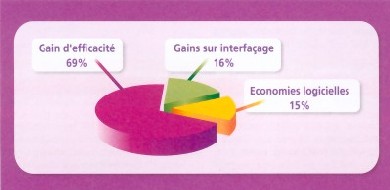 Un premier type de gain est un gain d’efficacité informatique et notamment en agissant sur un budget « caché » relatif aux coûts d’intégration. Ceux-ci sont estimés par le Gartner Group à un tiers du budget informatique des entreprises et à 40% par IBM Global services. Or ces solutions permettent de réduire des coûts de développement des interfaces mais surtout les coûts de maintenance. Sur une base moyenne plutôt pessimiste de gain de 25% sur le développement et la maintenance d’interfaces, sachant qu’un industriel consacre environ 2% de son CA à l’informatique, le gain potentiel annuel est donc de 0,15% du CA soit un gain 150K€ annuel pour un industriel réalisant 100M€ de CA.