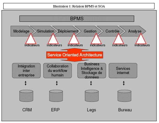 SOA et BPMS sont souvent cités conjointement. Il existe cependant une distinction claire entre BPMS et SOA. Un BPMS ne peut apporter une valeur ajoutée que s’il a également accès à la couche d’intégration. Une SOA est alors le lien entre la couche d’intégration et la couche de gestion des processus. Une architecture BPMS utilise donc une architecture orientée sur le service afin d’avoir accès aux différentes applications sous-jacentes via une SOA. Vous découvrirez une reproduction schématique à l’illustration 1.