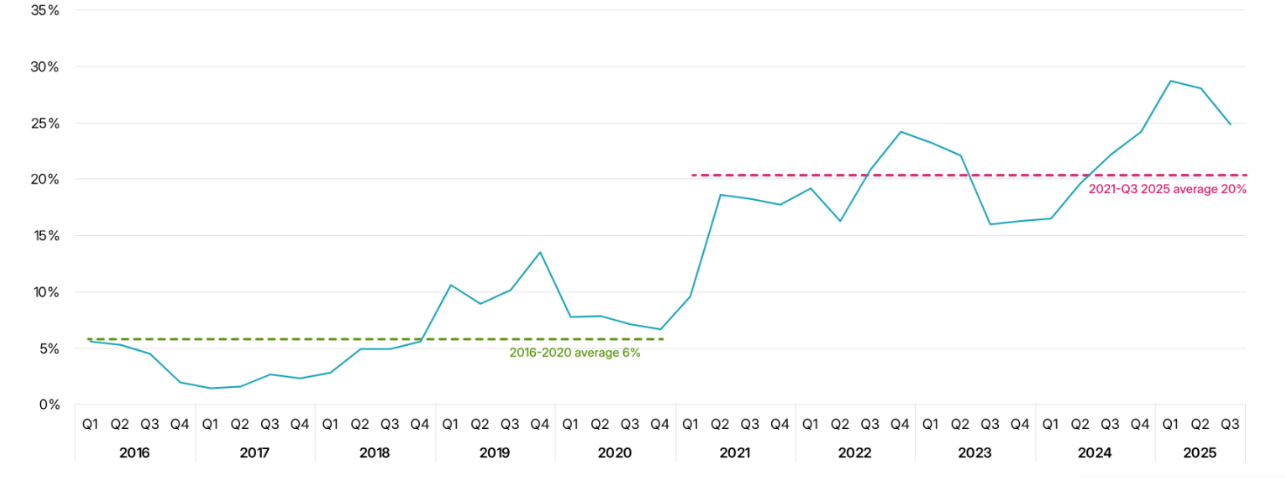 Entre 2016 et 2020, ils représentaient en moyenne 6 % des flux par rapport aux distributions des fonds matures. Entre 2021 et le troisième trimestre 2025, ce ratio est monté à 20 %, illustrant leur rôle croissant dans la gestion des portefeuilles.
