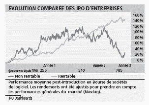 Ces sorts plutôt contrastés démontrent que les acheteurs d’actions d’émissions primaires ne semblent pas en mesure d’établir le prix de marché des sociétés issues du private equity. En revanche, le marché secondaire établit assez vite le prix de référence, en particulier lorsque les sociétés issues du capital- risque ne sont pas rentables (voir graphique); ou que leur introduction correspond à une tentative de réduire le poids du levier financier du LBO (cas de HCA et Kinder Morgan).