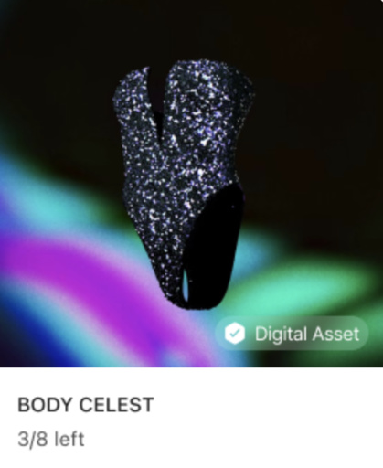 Une sélection de body du défilé a fait l’objet d’un déploiement en NFT, les spectateurs en faisant l’acquisition durant le show bénéficiaient alors de contenus exclusifs et autres avantages comme l’accès à l’organisation d’une private shopping party dans le magasin de leur choix.