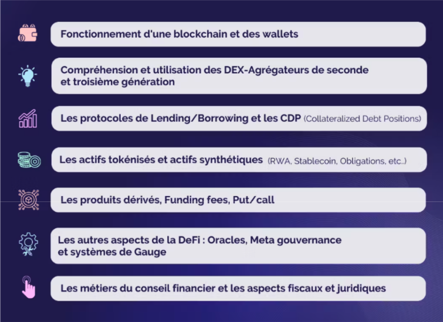 Les objectifs principaux de cette formation sont de former des acteurs à part entière de la DeFi, et d’accompagner des acteurs de la finance traditionnelle dans la découverte de cette technologie