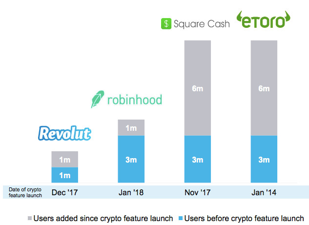 Fintech companies that added a cryptocurrency feature (such as enabling investment in Bitcoin), have seen user numbers double or even triple. Their user numbers shoot up in a non-linear fashion, following the launch of a crypto feature.