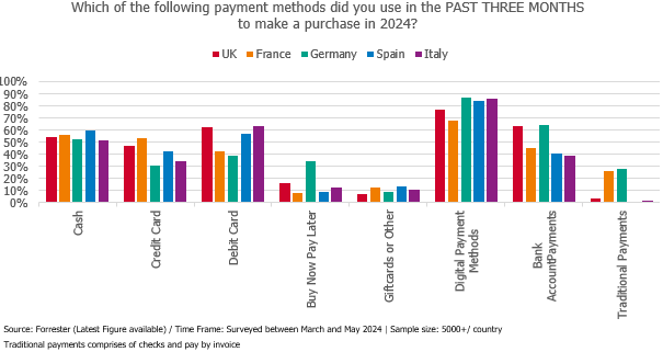 - Le paiement par carte de crédit est utilisé à 53 % en France, dépassant l’Allemagne (31 %).