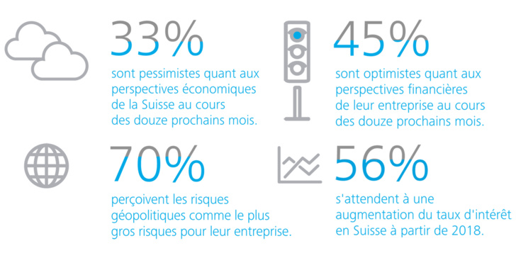 – Les autres risques évoqués par les CFO sont la force du franc suisse, le renforcement des réglementations en Suisse et un manque de main d’œuvre qualifiée.
